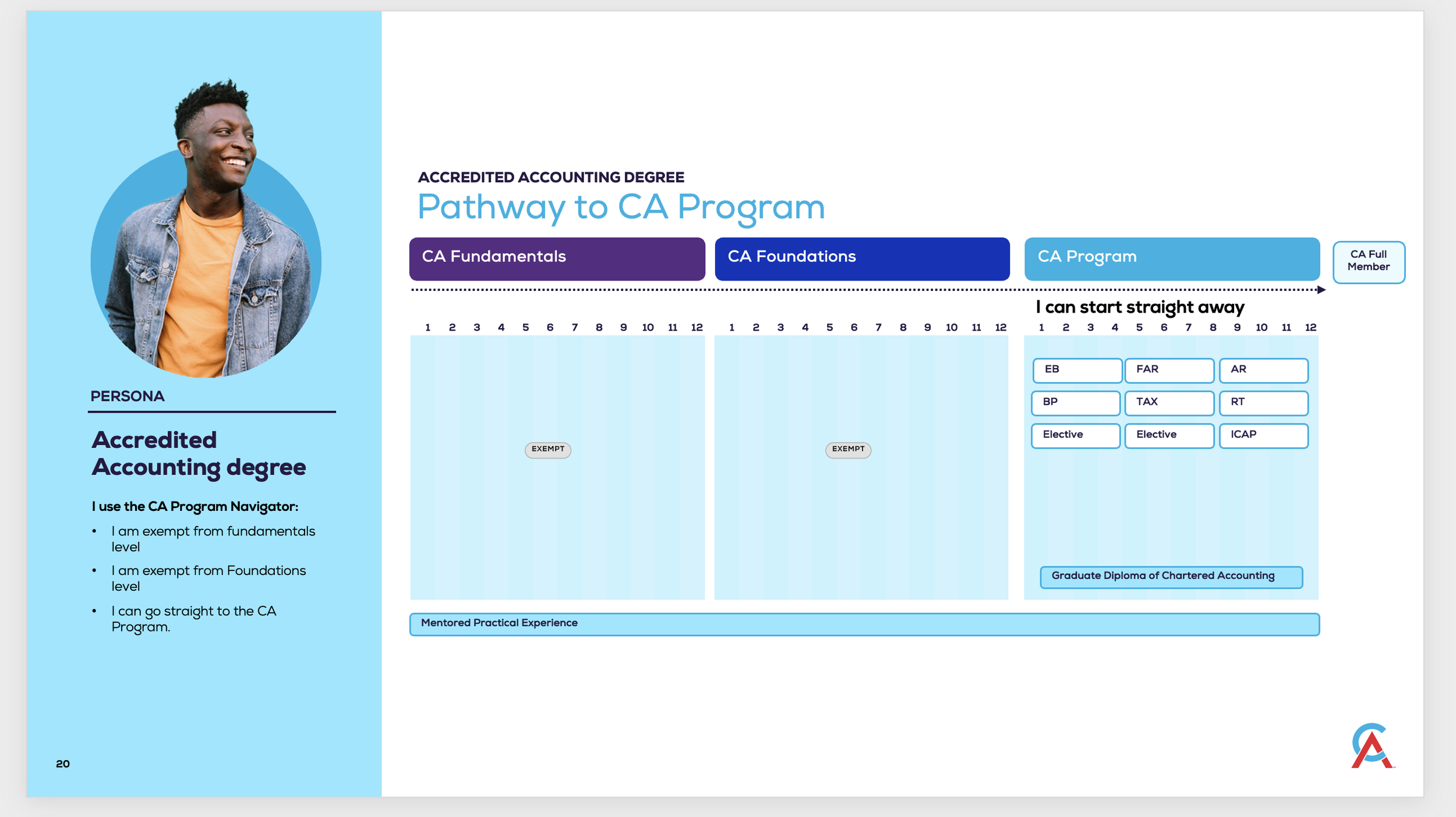 Depending on what study a person has completed they may be eligible for exemptions and / or need to do additional study to be ready to apply for the Post Grad level qualification that is the CA Program.